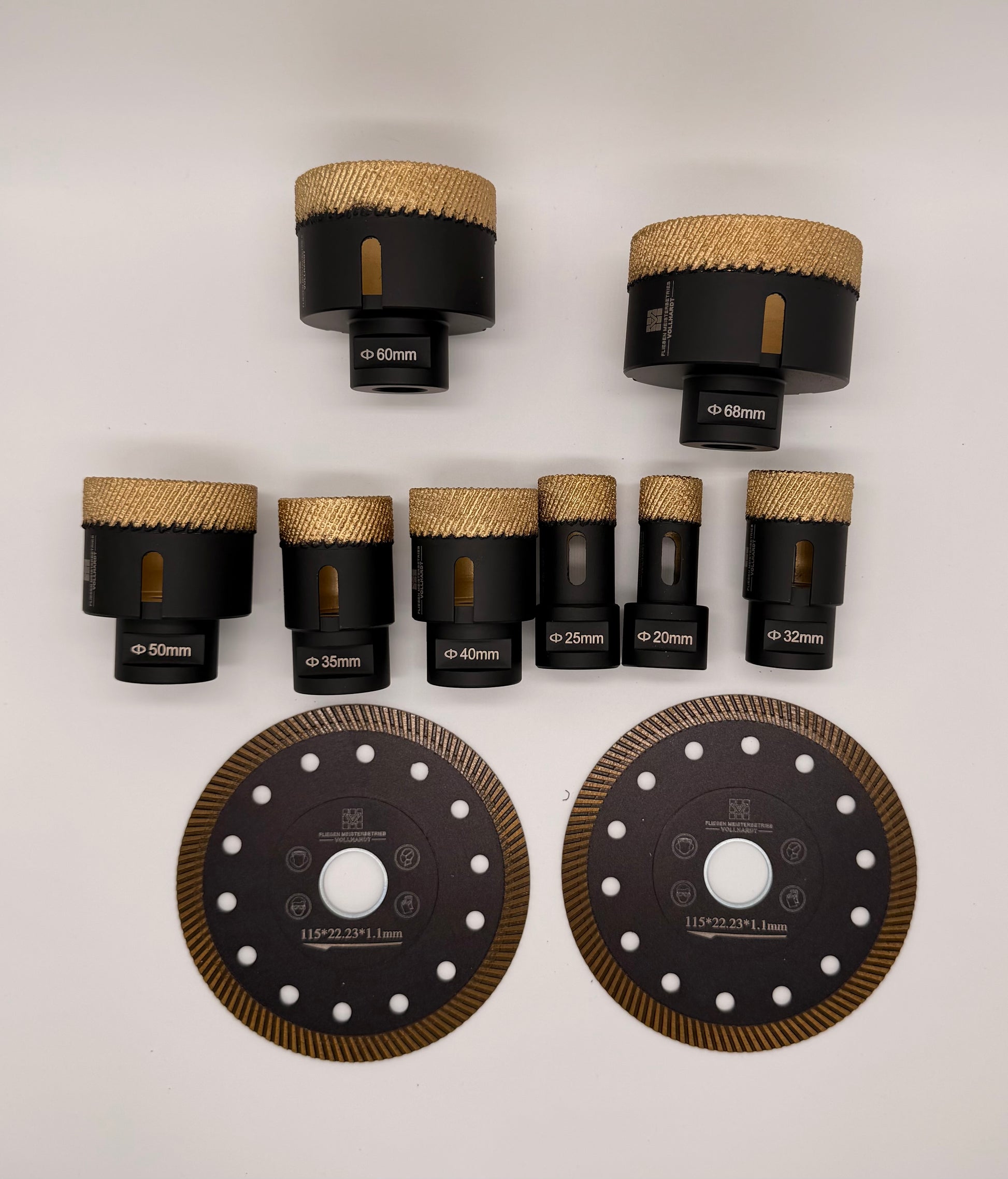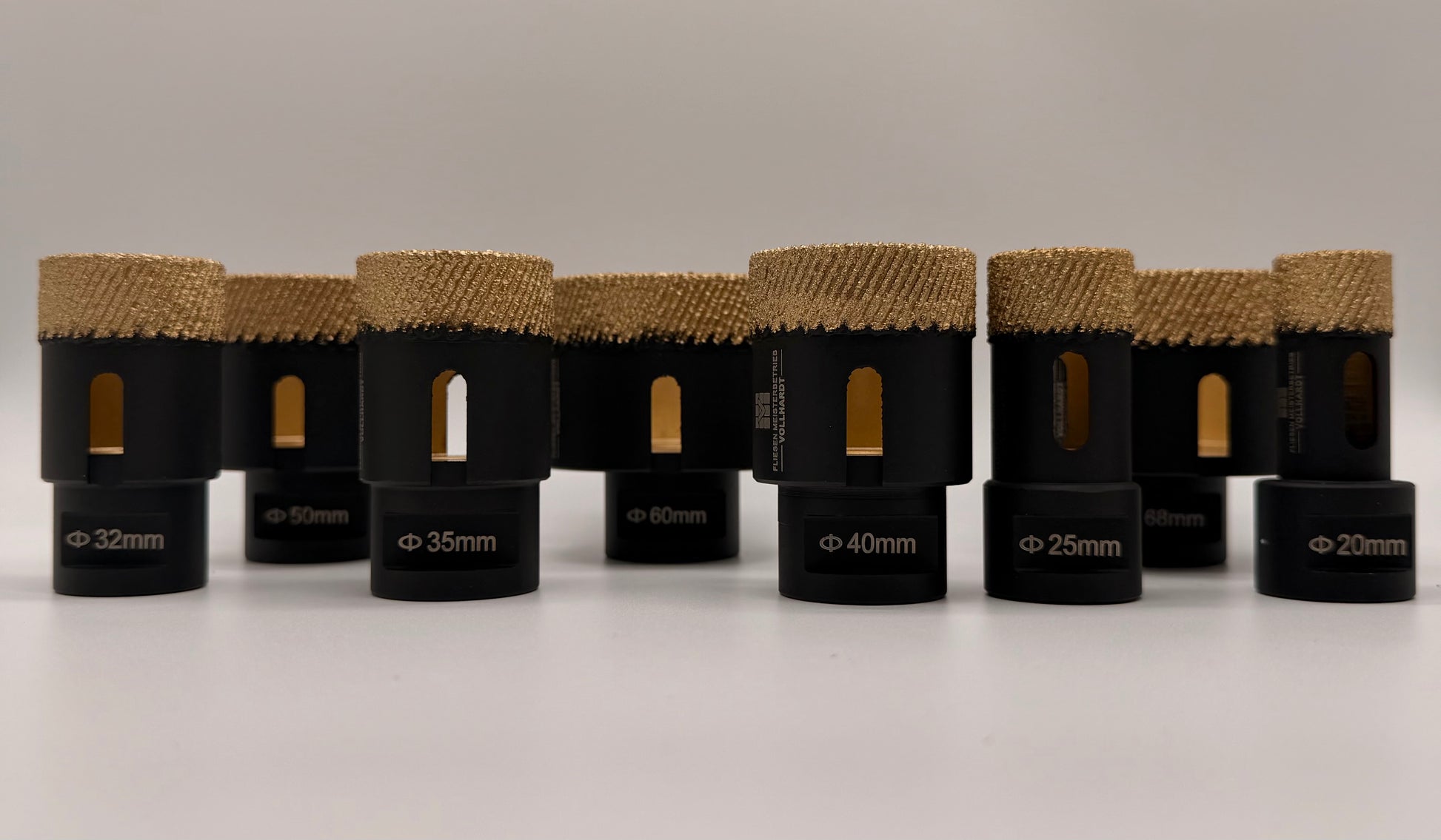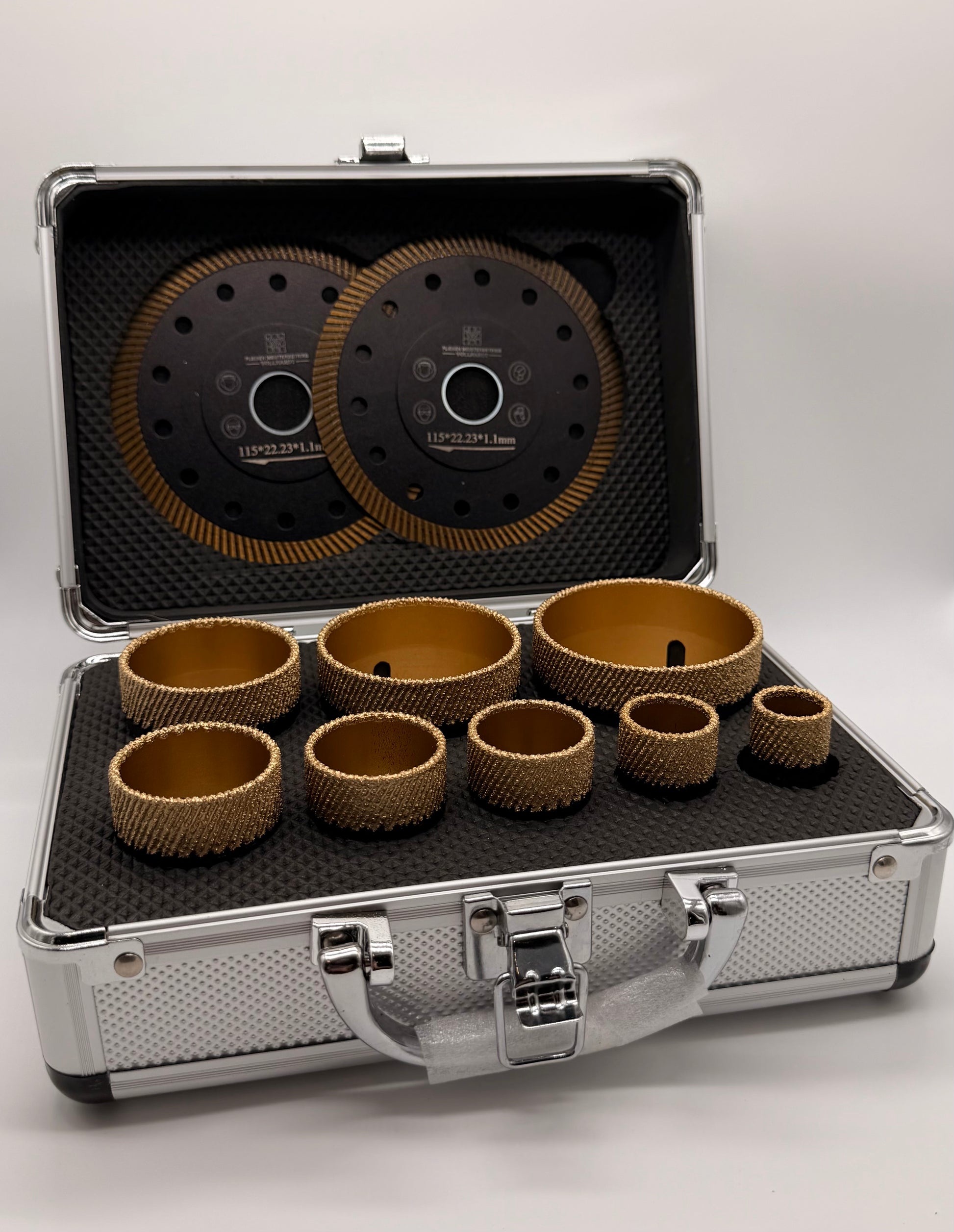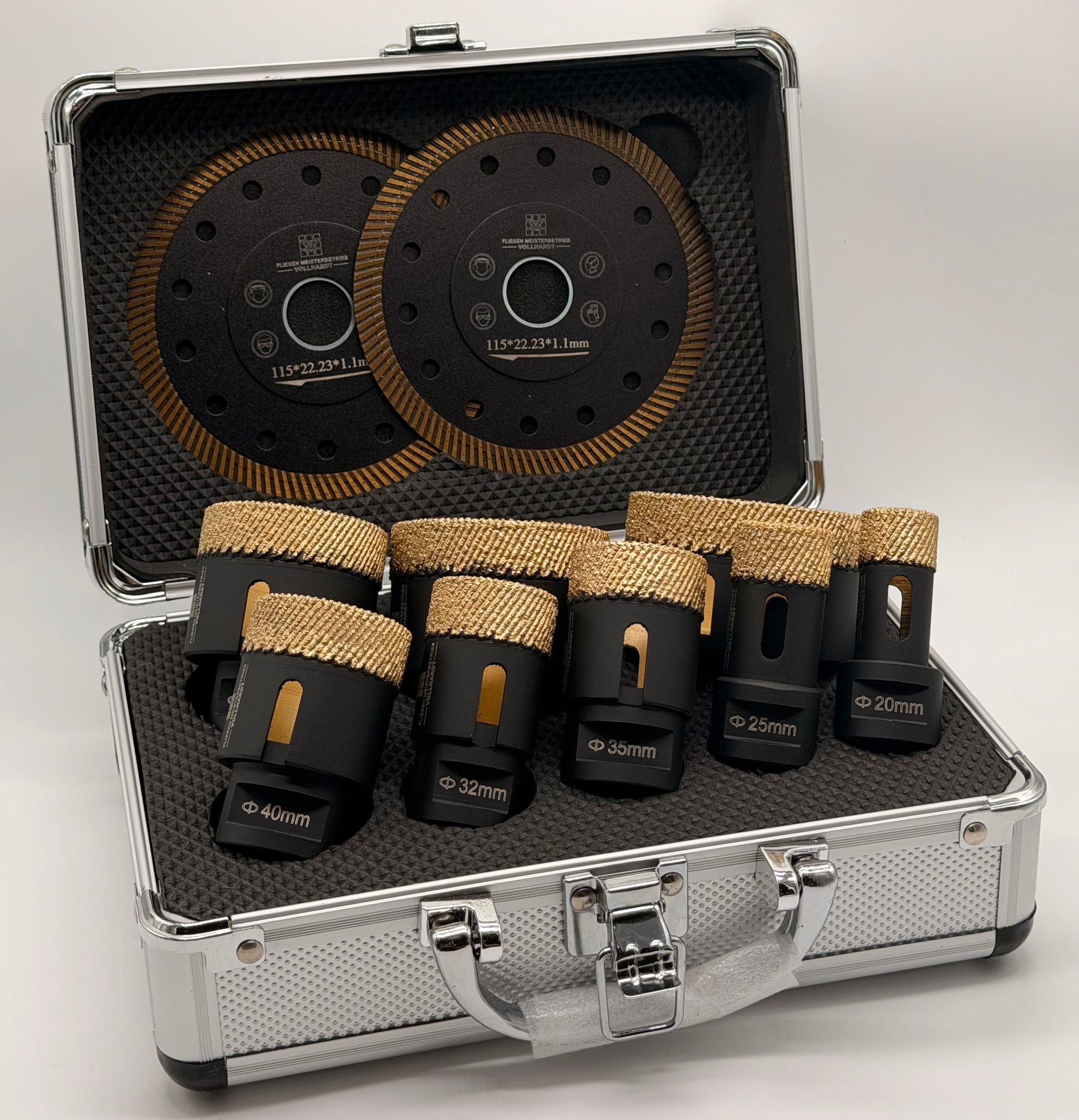 Der Matrix Bohrkronenkoffer Premium ist das ideale Set für den professionellen Einsatz im Fliesen-, Sanitär- und Natursteinbereich. Enthalten sind acht Diamant-Bohrkronen in den Größen 20 mm, 25 mm, 32 mm, 35 mm, 40 mm, 50 mm, 60 mm und 68 mm sowie zwei Premium-Trennscheiben mit 115 mm Durchmesser. Die Matrix-Bohrkronen überzeugen durch ihre spezielle Diamantanordnung, die für eine optimale Zirkulation sorgt, Überhitzung verhindert und eine besonders hohe Standzeit bietet. So entstehen saubere Bohrlöcher selbst in härtesten Materialien. Die mitgelieferten Flexscheiben sind echte Verkaufsschlager – sie schneiden präzise, laufen ruhig und behalten ihre Schärfe auch nach längerem Einsatz. Alles ordentlich und griffbereit verpackt im robusten Aluminiumkoffer, perfekt für den täglichen Gebrauch auf der Baustelle.